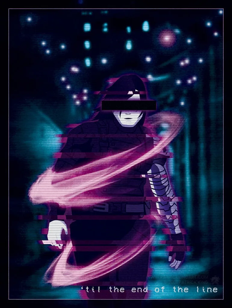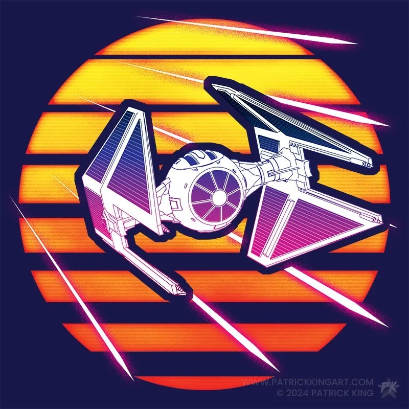Various TIE starfighters depicted in a neon retro synthwave style.