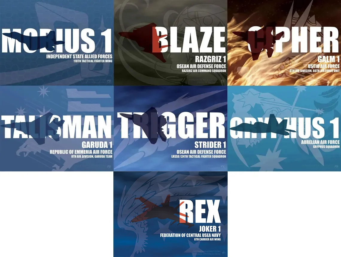 The protagonists of the Ace Combat series. This full set comes with Monarch from Project Wingman as a special bonus.