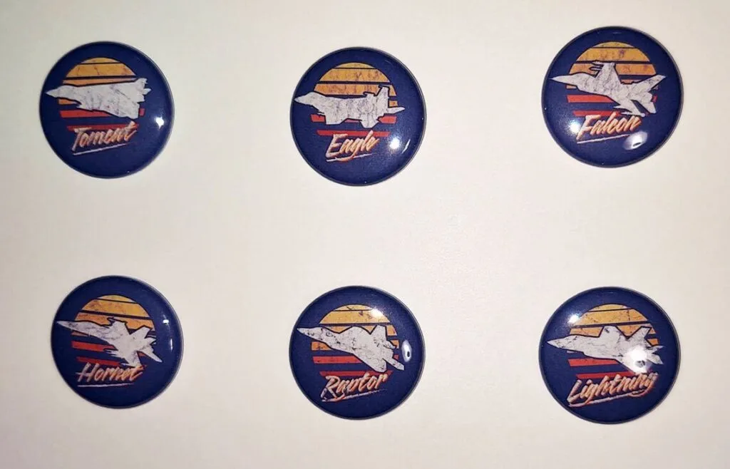 Throttle up and pull some G’s with these slick fighter jet buttons, featuring: