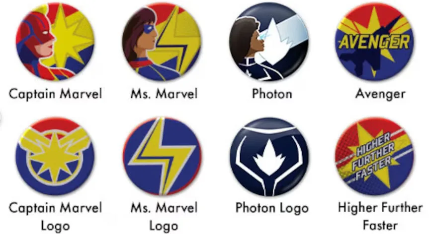 | Style | Full Set, Captain Marvel, Ms. Marvel, Photon, Avenger, Captain Marvel Logo, Ms. Marvel Logo, Photon Logo, HigherFurtherFaster, Pick 2, Pick 3, Pick 4, Pick 5, Pick 6, Pick 7 |